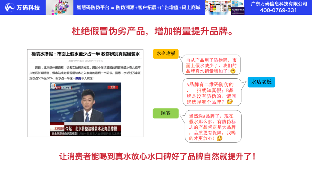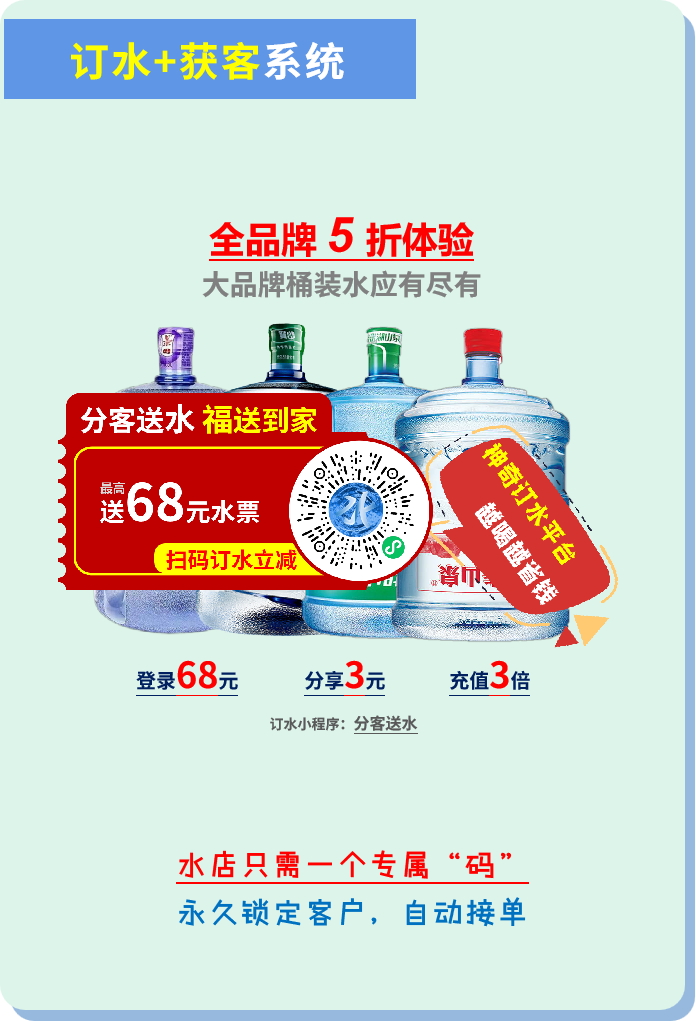 具体怎么实现呢?方法方式有很多种,但这种是成本低、收益快、易上手的一种:上线一桶一码防伪溯源营销系统+订水集合平台系统,实现企业自身销售生态链的强力打造。