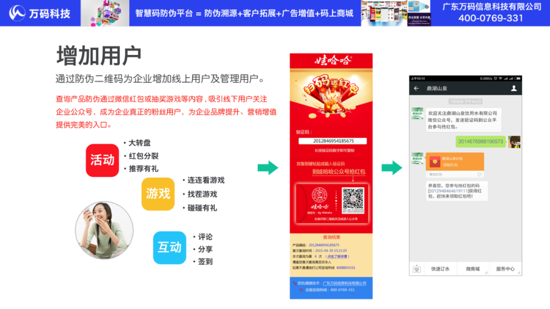 核心点:利用一桶一码防伪溯源树立品牌权威,运用抢红包或抽奖建立客户互动,从而引导客户到服务号订水商城上面来订水,实现营销、推广、订单、管理的闭环生态建设。