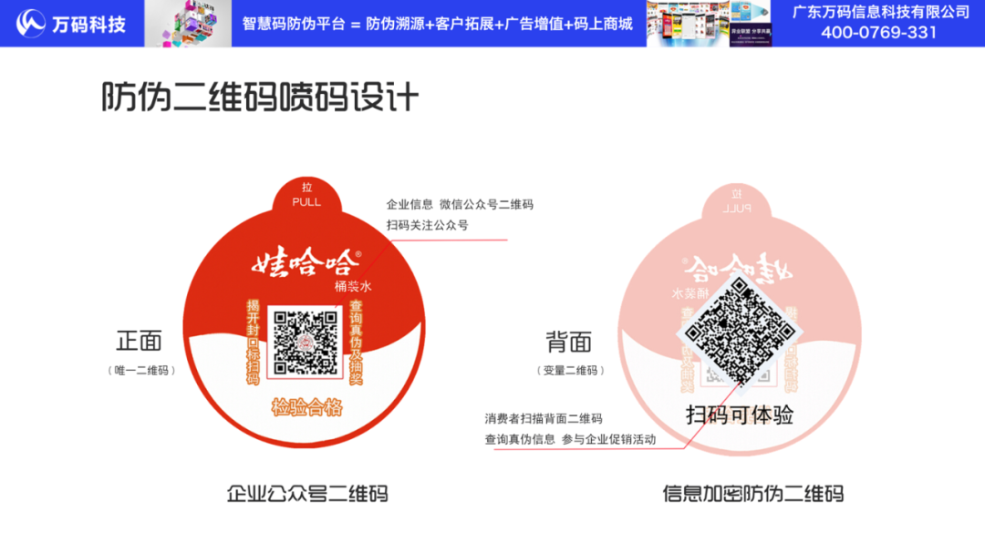 一桶水上面有防伪营销码与没有防伪营销码的展示效果,给消费者信心肯定是有差异的。